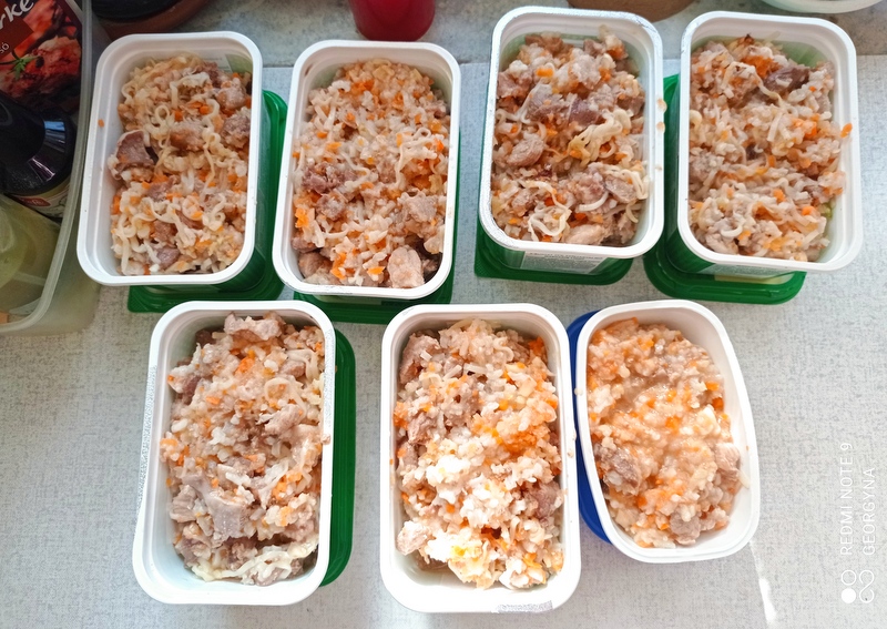 - Amikor a hús és a rizs megfőtt, a húshoz kevertem a rizst, tésztát, és a nyers zöldséget.
