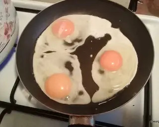 A serpenyőbe olajat tenni. Amikor még langyos, óvatosan beleengedni a tojásokat, vigyázva, hogy ne menjen szét a sárgája. Ha langyos az olaj, nem köpködi össze a kezünket.